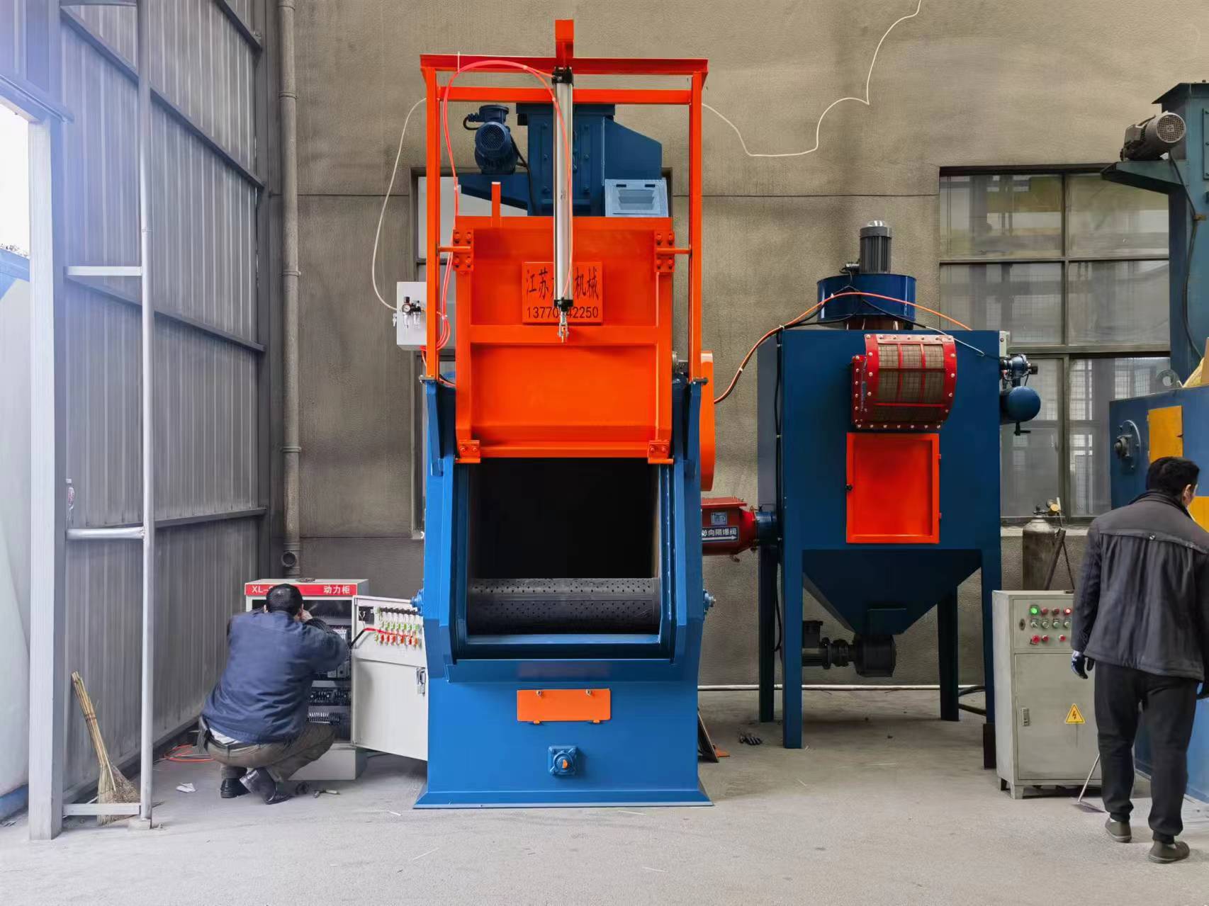 Q3210气动大门履带抛丸机,用于铝压铸件表面清理强化,锰13内衬板,气动大门,隔爆阀、无火熖装置、缷灰装置!
