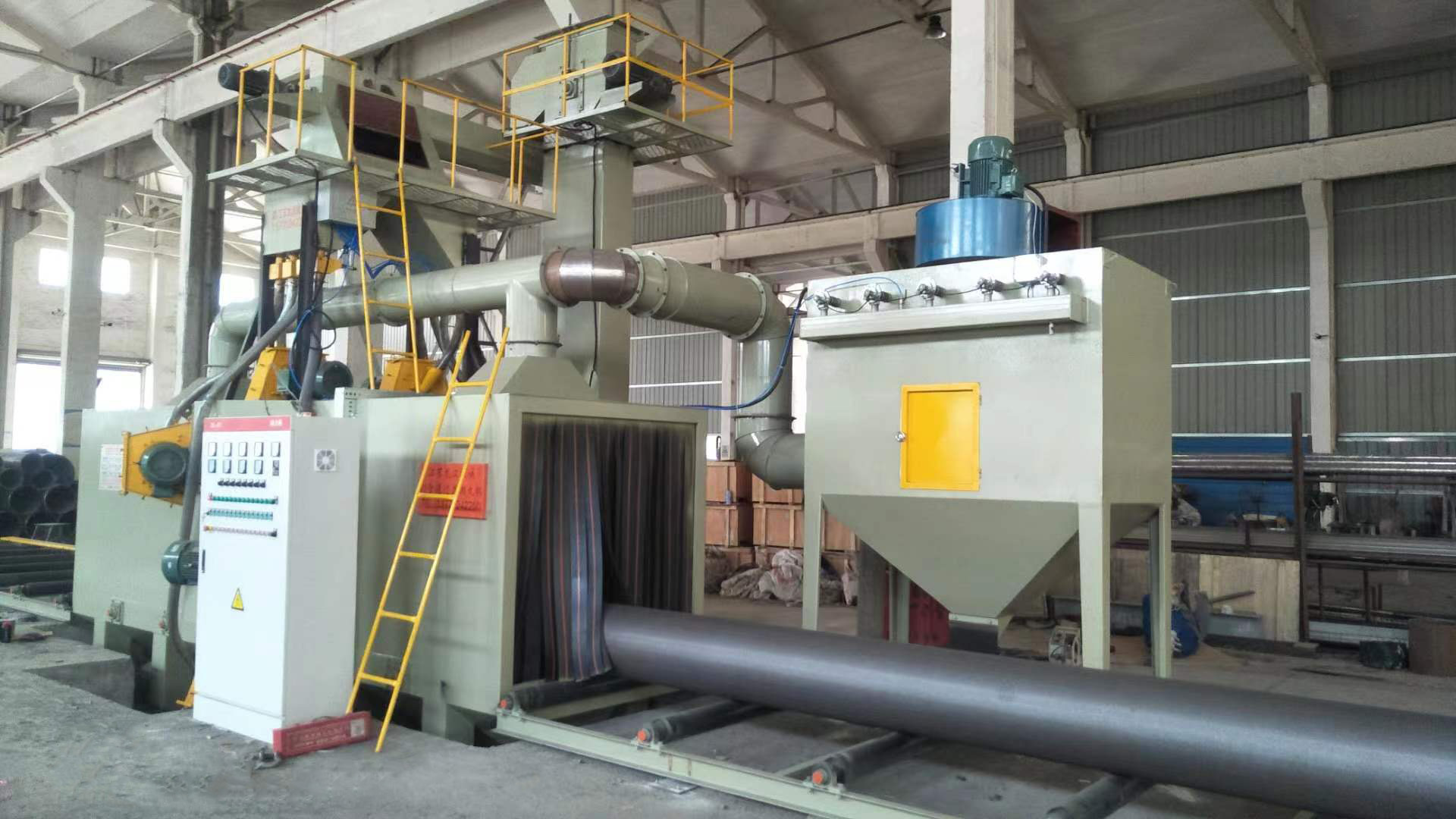 【钢管外壁辊道通过式抛丸机现场】: